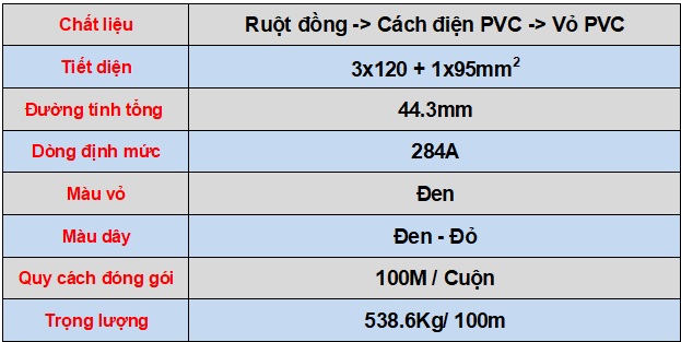 Dây cáp điện cứng 4 lõi CVV 3x120+1x95 Lion